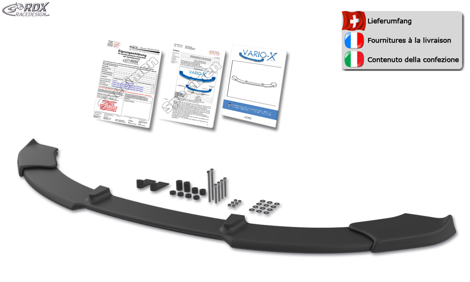 Der VARIO-X ist ein innovatives Qualitätsprodukt von RDX. Dieser formschöne Frontspoiler wird aus hochwertigem PUR Kunststoff (Polyurethan) hergestellt. Dieses Material wird auch in der Erstausrüstung verwendet und ist äußerst bruchsicher. Der VARIO-X wird unlackiert in schwarz geliefert und hat eine sauber verarbeitete, lackierfreundliche Oberfläche.