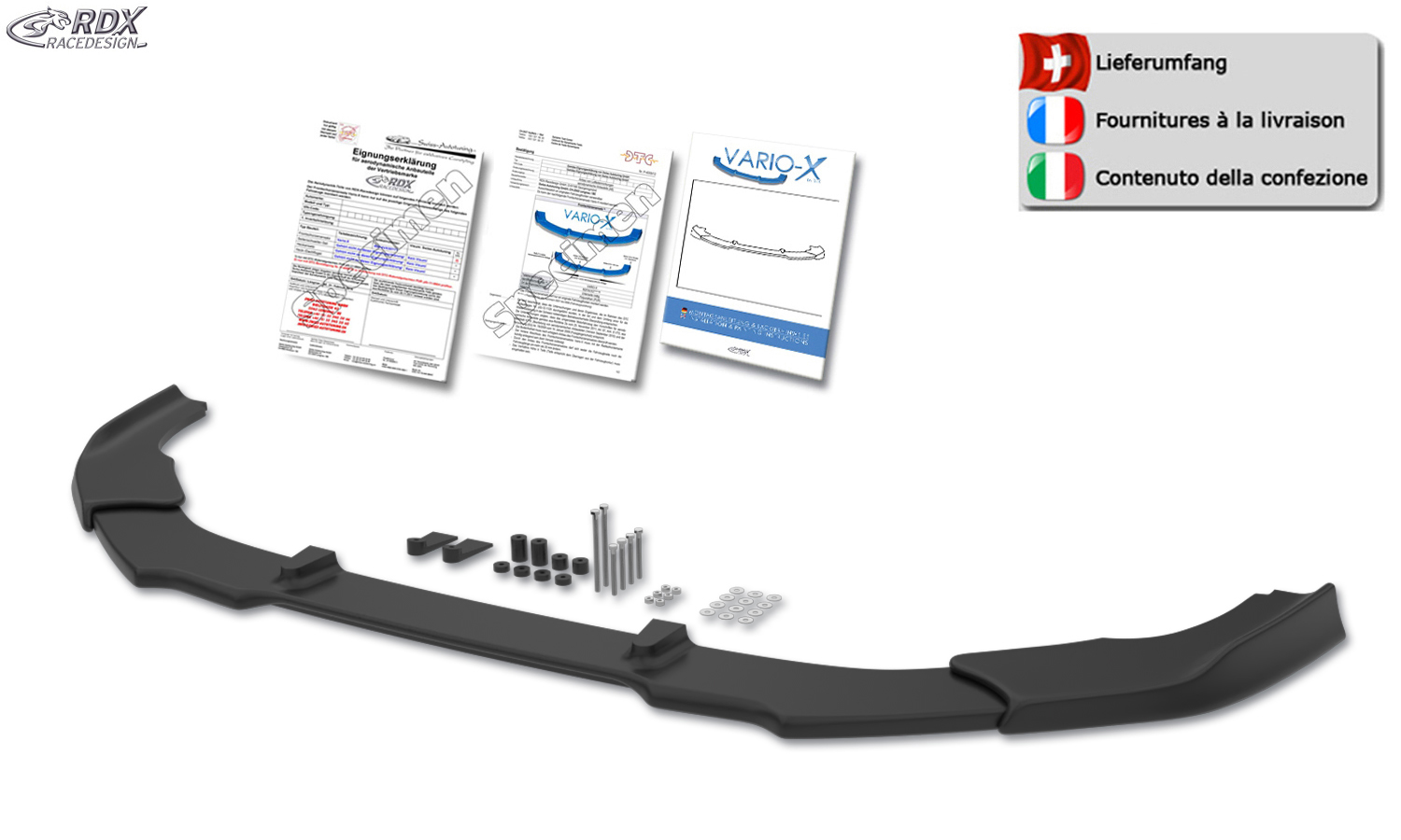 Der VARIO-X ist ein innovatives Qualitätsprodukt von RDX. Dieser formschöne Frontspoiler wird aus hochwertigem PUR Kunststoff (Polyurethan) hergestellt. Dieses Material wird auch in der Erstausrüstung verwendet und ist äußerst bruchsicher. Der VARIO-X wird unlackiert in schwarz geliefert und hat eine sauber verarbeitete, lackierfreundliche Oberfläche.