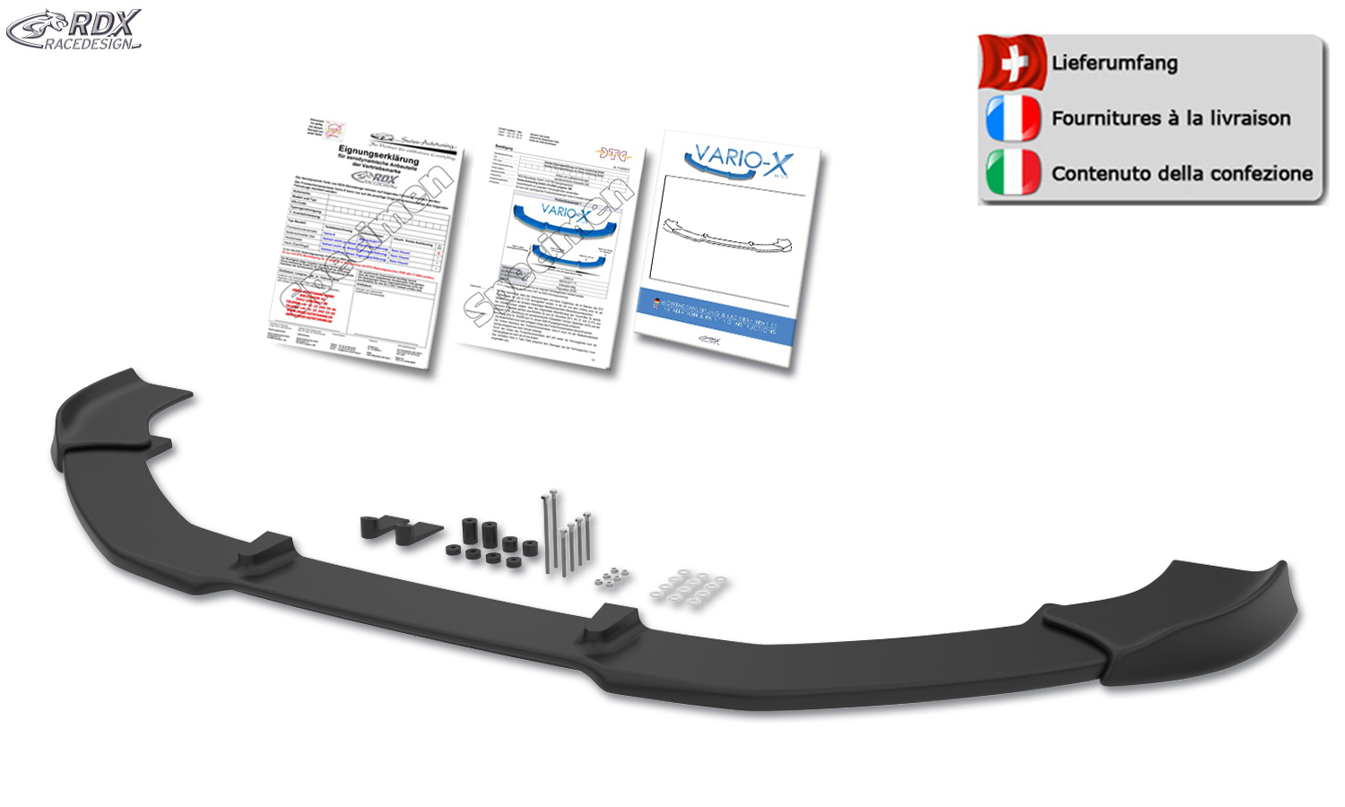 Der VARIO-X ist ein innovatives Qualitätsprodukt von RDX. Dieser formschöne Frontspoiler wird aus hochwertigem PUR Kunststoff (Polyurethan) hergestellt. Dieses Material wird auch in der Erstausrüstung verwendet und ist äußerst bruchsicher. Der VARIO-X wird unlackiert in schwarz geliefert und hat eine sauber verarbeitete, lackierfreundliche Oberfläche.