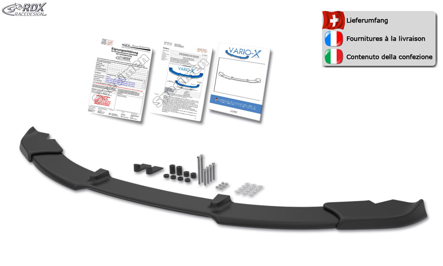 Der VARIO-X ist ein innovatives Qualitätsprodukt von RDX. Dieser formschöne Frontspoiler wird aus hochwertigem PUR Kunststoff (Polyurethan) hergestellt. Dieses Material wird auch in der Erstausrüstung verwendet und ist äußerst bruchsicher. Der VARIO-X wird unlackiert in schwarz geliefert und hat eine sauber verarbeitete, lackierfreundliche Oberfläche.