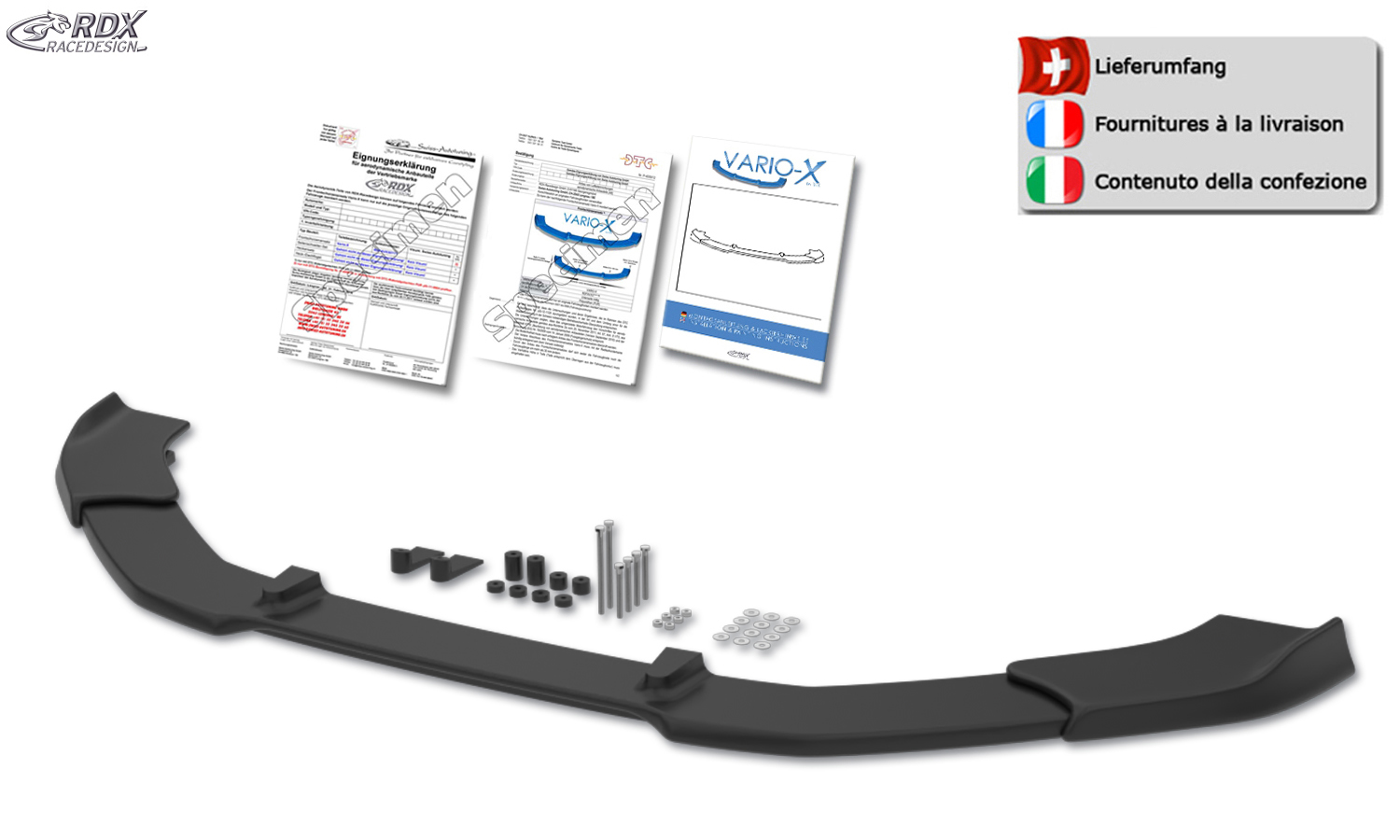 Der VARIO-X ist ein innovatives Qualitätsprodukt von RDX. Dieser formschöne Frontspoiler wird aus hochwertigem PUR Kunststoff (Polyurethan) hergestellt. Dieses Material wird auch in der Erstausrüstung verwendet und ist äußerst bruchsicher. Der VARIO-X wird unlackiert in schwarz geliefert und hat eine sauber verarbeitete, lackierfreundliche Oberfläche.